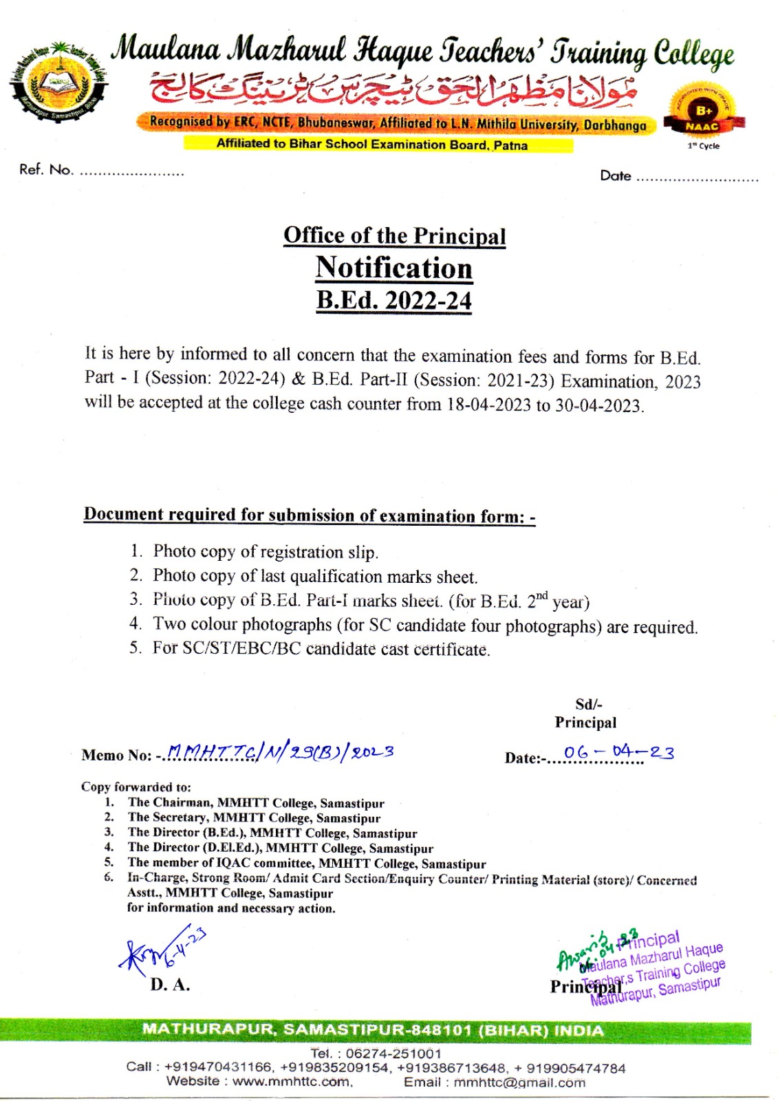 B.ed 1st Year (2022-24) & B.ed 2nd Year (2021-23) Examination Fee Notice